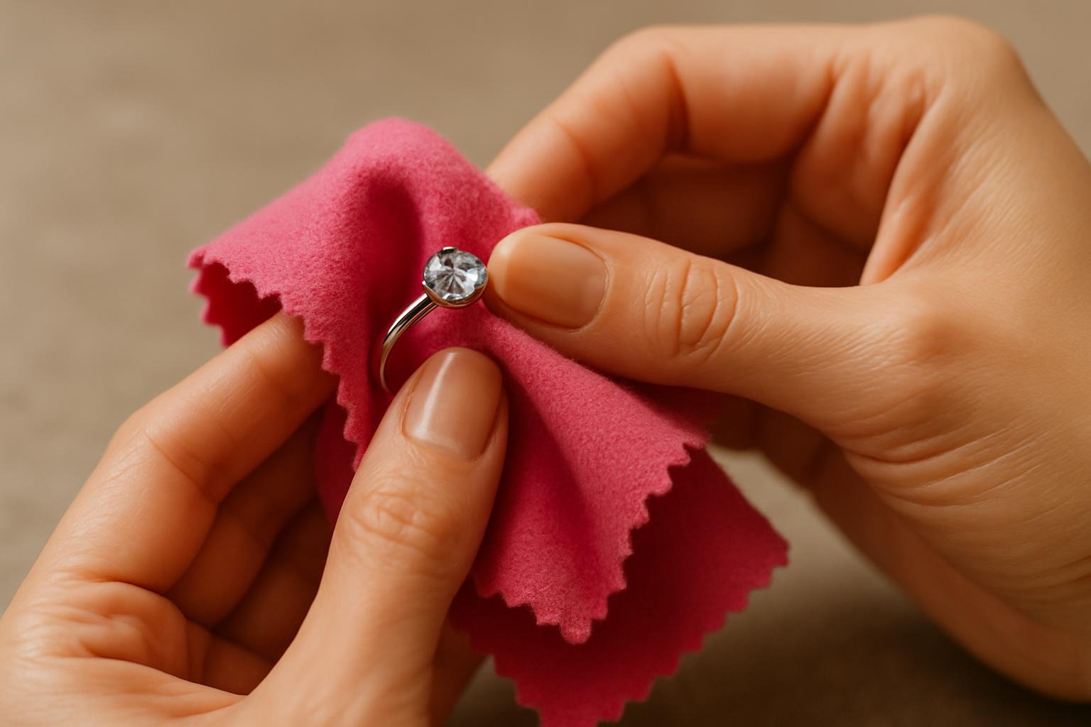 Imagem sugerida: Mãos femininas polindo uma joia com flanela macia